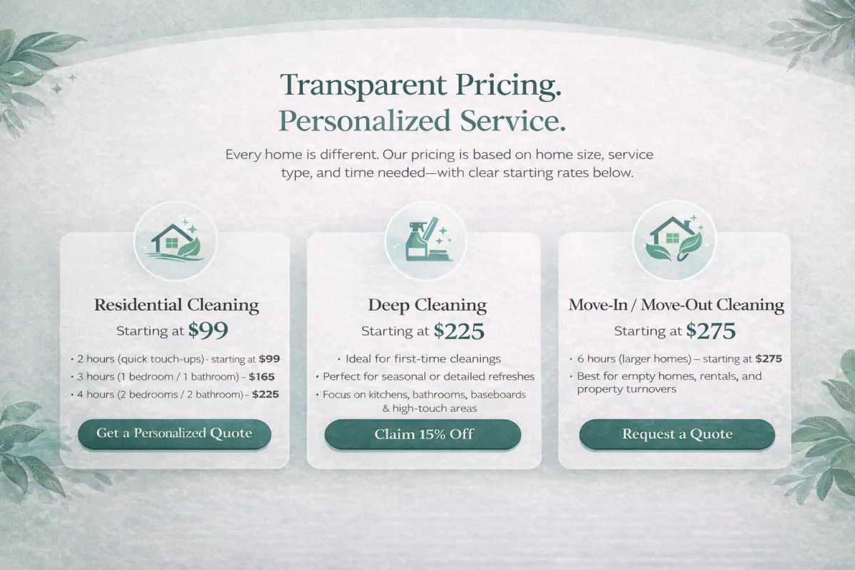 Warm, vetted cleaners • Flexible scheduling • Transparent, upfront pricing